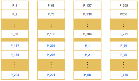 As you add more members, Hazelcast one-by-one moves some of the primary and replica partitions to the new members, making all members equal and redundant. Only the minimum amount of partitions will be moved to scale out Hazelcast. The following is an illustration of the partition distributions in a Hazelcast cluster with 4 members.