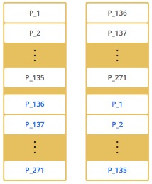 When you start a second node on that cluster (creating a Hazelcast cluster with 2 members), the partitions are distributed as shown in the following illustration.