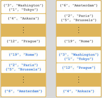 Now, let's create a second member by running the above code again. This will create a cluster with 2 members. This is also where backups of entries are created; remember the backup partitions mentioned in the Hazelcast Overview section. The following illustration shows two members and how the data and its backup is distributed.