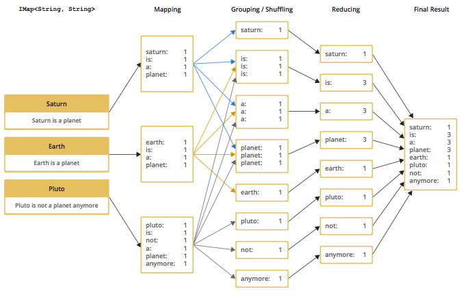 The flowchart below demonstrates the basic workflow of the word count example (distributed occurrences analysis) mentioned in the MapReduce section. From left to right, it iterates over all the entries of a data structure (in this case an IMap). In the mapping phase, it splits the sentence into single words and emits a key-value pair per word: the word is the key, 1 is the value. In the next phase, values are collected (grouped) and transported to their corresponding reducers, where they are eventually reduced to a single key-value pair, the value being the number of occurrences of the word. At the last step, the different reducer results are grouped up to the final result and returned to the requester.
